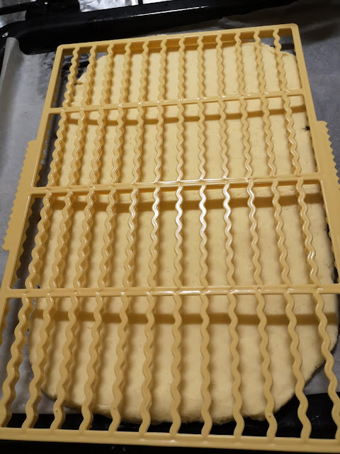 Ezután kinyújtjuk és felcsíkozzuk lekenjük tojással és megszórjuk laktózmentes reszelt sajttal.